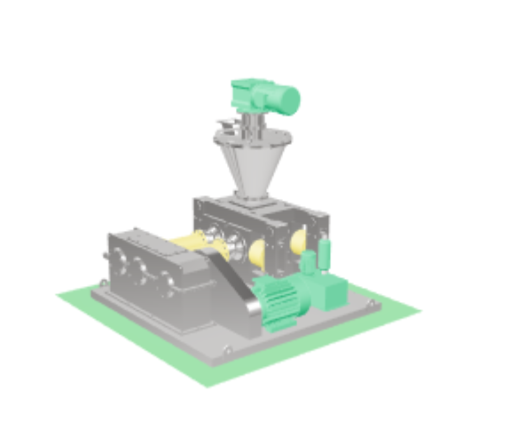 各種干粉物料從設(shè)備頂部加入,經(jīng)脫氣、螺旋預(yù)壓進(jìn)入兩個平等軋輥,軋輥相對旋轉(zhuǎn),物料被強(qiáng)制送入兩輥之間,軋輥將物料咬入輥隙進(jìn)行壓縮,物料通過壓縮區(qū)后,物料的表面力和 重力使之自然脫出。脫出后的指條狀團(tuán)塊進(jìn)入碎粒機(jī)由旋轉(zhuǎn)刀排破碎,被破碎的物料進(jìn)入整粒 機(jī)通過滾動刀排使顆粒和部分粉狀物料進(jìn)入旋振篩進(jìn)行篩分。合格品通過輸送機(jī)被送入成品倉。粉狀篩下物料通過輸送機(jī)再次被送回原料倉進(jìn)行二次輥壓,擠壓力的大小不一可根據(jù)造粒操作的需要由液壓油缸的壓力進(jìn)行調(diào)節(jié)。
