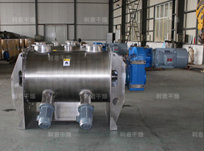 該機(jī)型由傳動(dòng)機(jī)構(gòu)、臥式筒體、犁刀、飛刀四部分組成,物料在犁刀作用下沿筒壁作軸向流支,當(dāng)物料流經(jīng)飛刀時(shí)被高速度旋轉(zhuǎn)的飛刀拋灑,從而在較短時(shí)間內(nèi)達(dá)到均勻混合。
