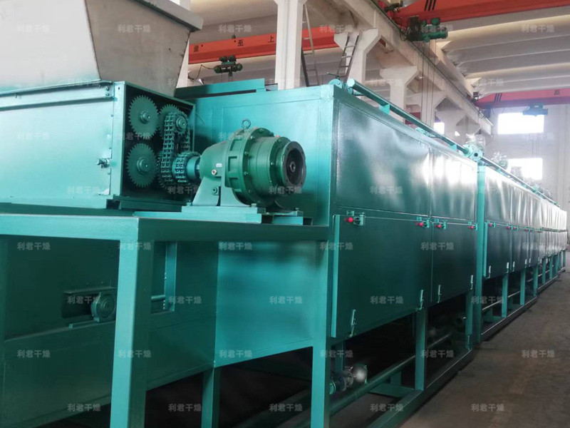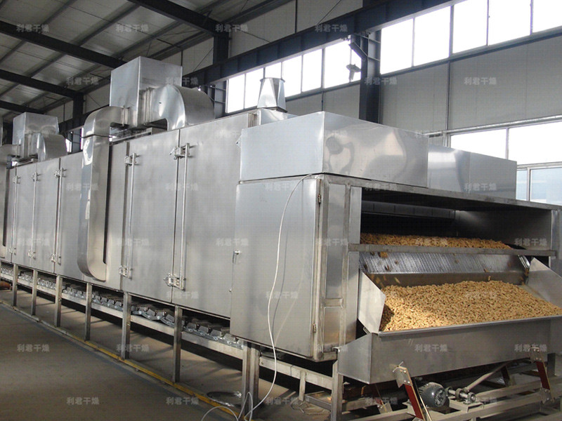 物料由加料器均勻地鋪在網(wǎng)帶上,網(wǎng)帶一般采用12-60目不銹鋼絲網(wǎng),由傳動(dòng)裝置拖動(dòng)在干燥機(jī)內(nèi)移動(dòng)。干燥機(jī)由若干單元組成,每一單元熱風(fēng)獨(dú)立循環(huán),部分尾氣由專門(mén)排濕風(fēng)機(jī)排出,廢氣由調(diào)節(jié)閥控制,熱氣由下往上或由上往下穿過(guò)鋪滿物料的網(wǎng)帶完成熱量與質(zhì)量傳遞的進(jìn)程,帶走物料水份。網(wǎng)帶緩慢移動(dòng),運(yùn)行速度可根據(jù)物料溫度自由調(diào)節(jié),干燥后的成品連續(xù)落入收料器中。上下循環(huán)單元根據(jù)用戶需要可靈活配備,單元數(shù)量亦可根據(jù)需要選取。