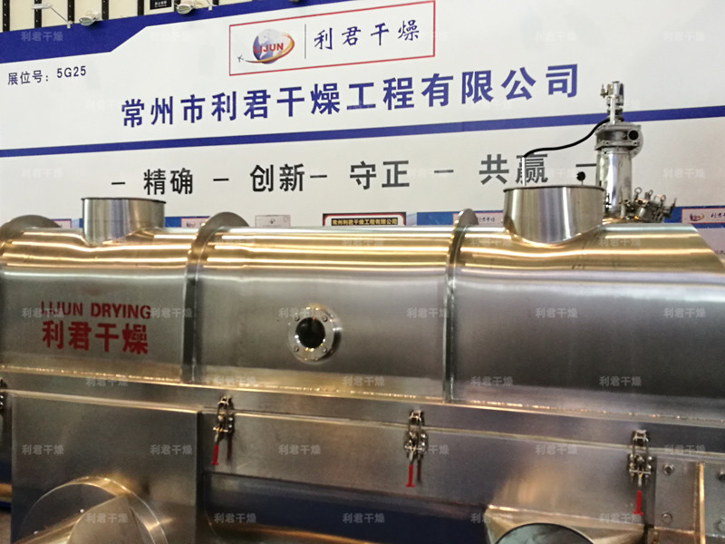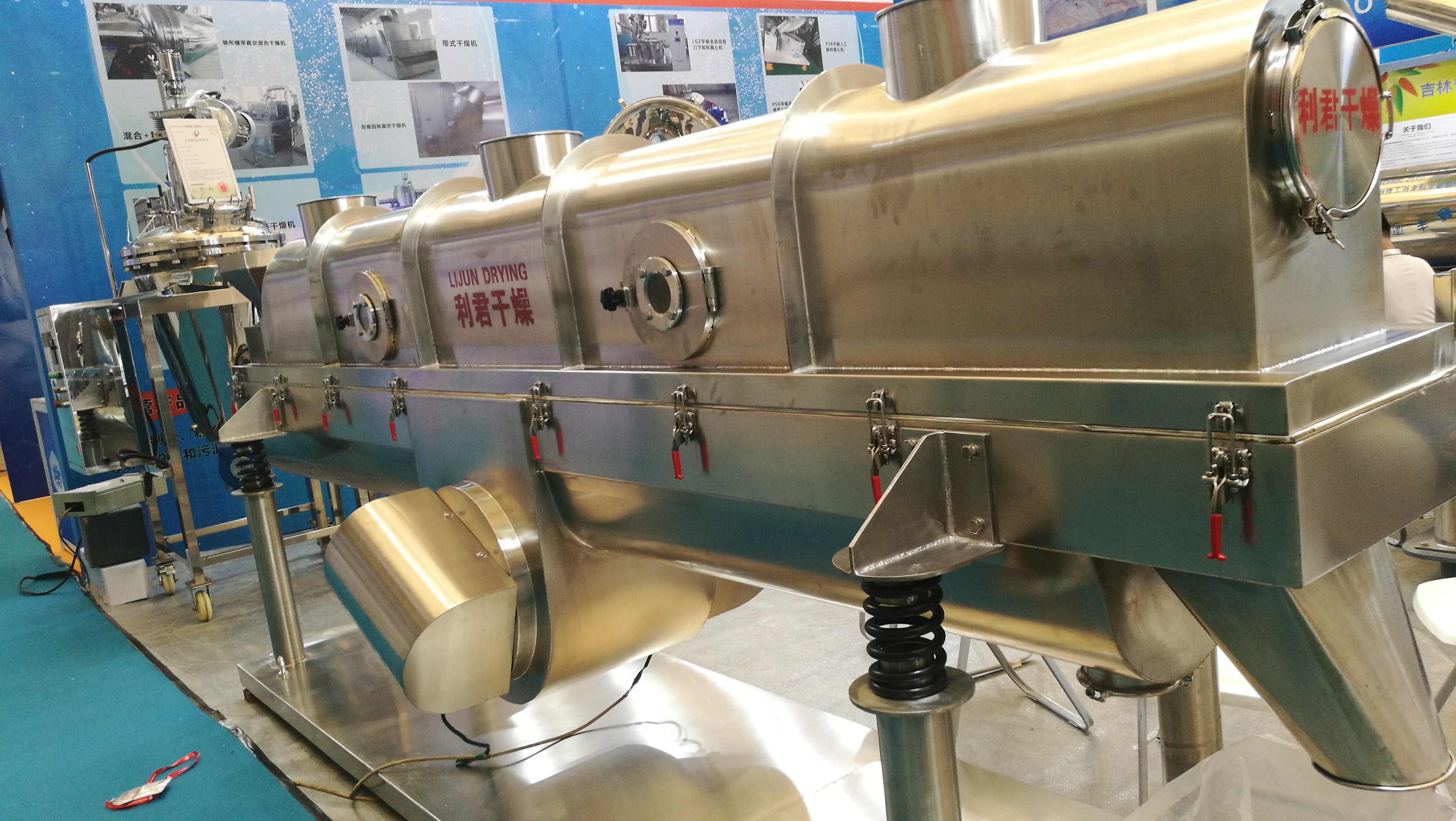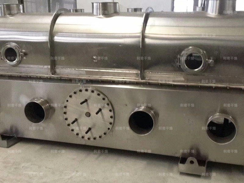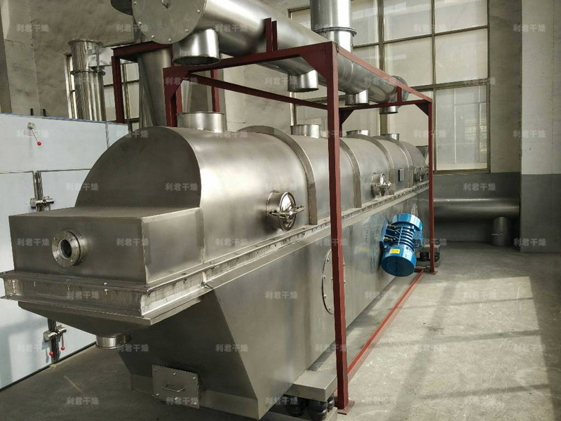流化床干燥機是由物料自進(jìn)料進(jìn)口進(jìn)入機內(nèi),在振動力作用下,物料沿水平面流化床拋擲,向前連續(xù)運動,熱風(fēng)向上穿過流化床同濕物料換熱后,濕空氣經(jīng)旋風(fēng)分離器除塵后由排風(fēng)1:3排出,干燥物料由排料進(jìn)口排出。