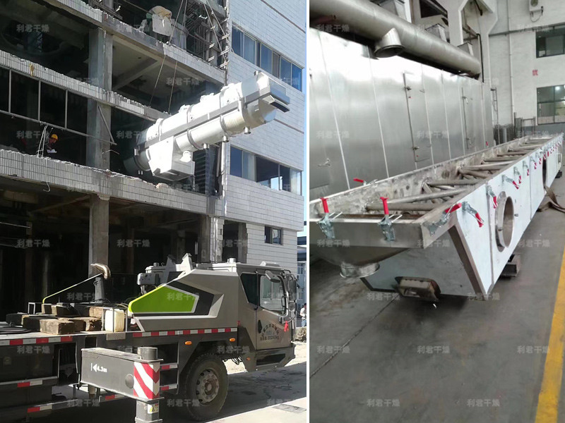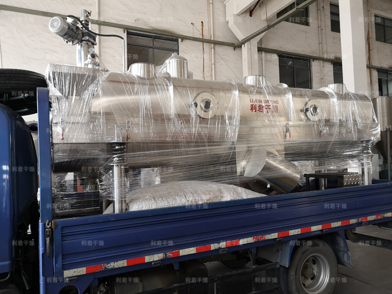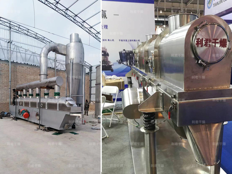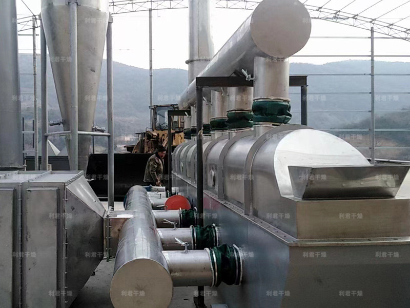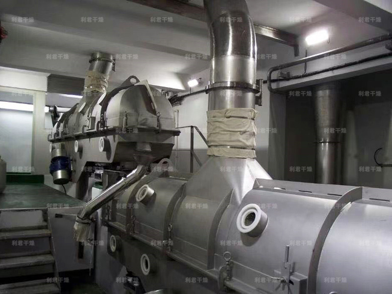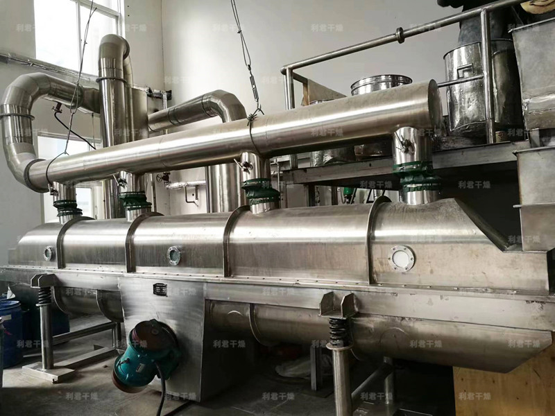 物料自進(jìn)料進(jìn)口進(jìn)入機內(nèi),在振動力作用下,物料沿水平面流化床拋擲,向前連續(xù)運動,熱風(fēng)向上穿過流化床同濕物料換熱后,濕空氣經(jīng)旋風(fēng)分離器除塵后由排風(fēng)1:3排出,干燥物料由排料進(jìn)口排出。