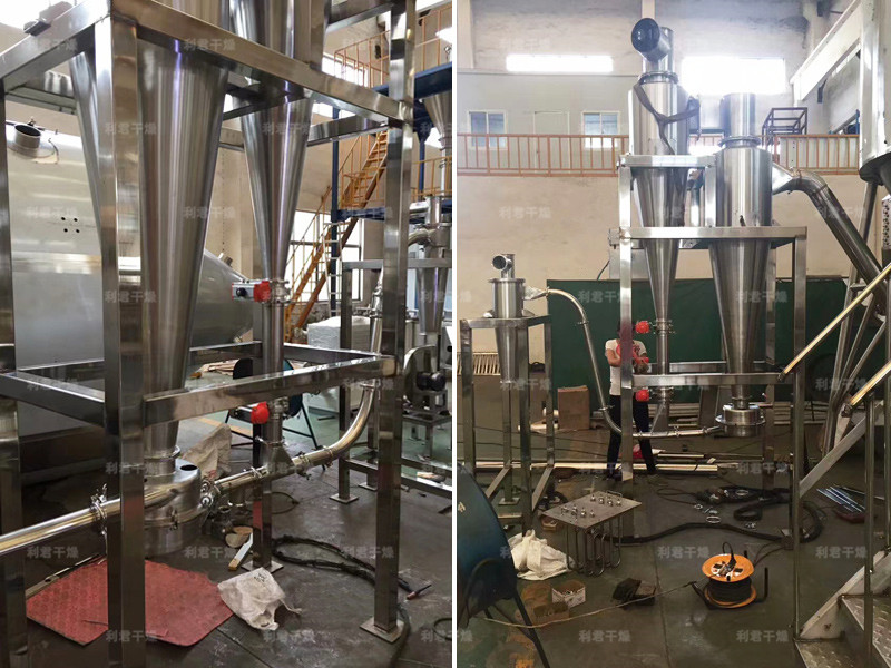 該機(jī)采用全封閉形式,所有部件均采用不銹鋼制造,配有三級凈化裝置,過濾后的空氣達(dá)十萬級要求。筒體與頂部裝有冷壁裝置,使壁溫<80℃,干燥塔內(nèi)裝有氣刷掃塔裝置。經(jīng)該機(jī)干燥后的中藥浸膏粉,不會出現(xiàn)焦化變質(zhì)現(xiàn)象,大大增加了收粉率(95%以上),而且不會產(chǎn)生混藥現(xiàn)象和粘壁現(xiàn)象。