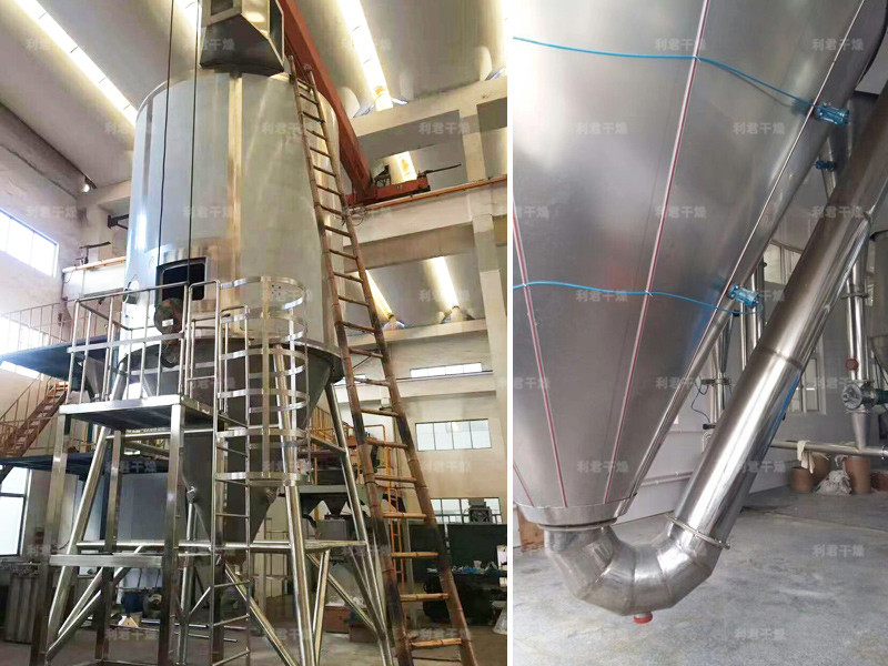 空氣經(jīng)過濾和加熱,進(jìn)入干燥器頂部空氣分配器,熱空氣呈螺旋狀均勻地進(jìn)入干燥室。料液經(jīng)塔體頂部的高速離心霧化器,(旋轉(zhuǎn))噴霧成極細(xì)微的霧狀液珠,與熱空氣并流接觸在極短的時(shí)間內(nèi)可干燥為成品。成品連續(xù)地由干燥塔底部和旋風(fēng)分離器中輸出,廢氣由風(fēng)機(jī)排空。
